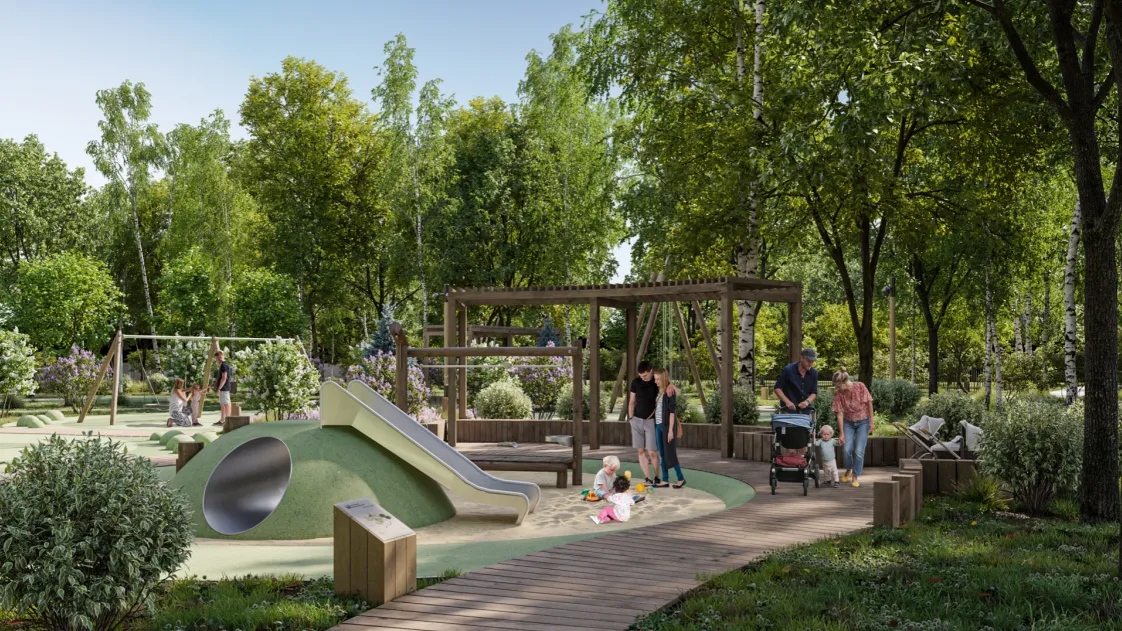 Проект предусматривает создание трех основных маршрутов: прогулочного вдоль реки Клязьма с оборудованными подходами к воде, двухсторонней велодорожки для разделения потоков пешеходов и велосипедистов, а также лесного маршрута, соединяющего событийную площадь с выходом в сторону физкультурно-оздоровительного комплекса. Лесной маршрут подойдет для спортивной ходьбы, бега и выгула животных.